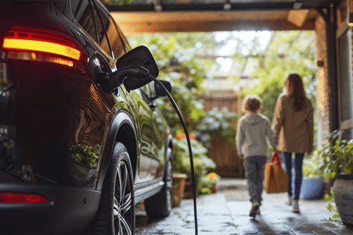Bilde viser en elbil som står i garasje og lades. To personer forlater garasjen